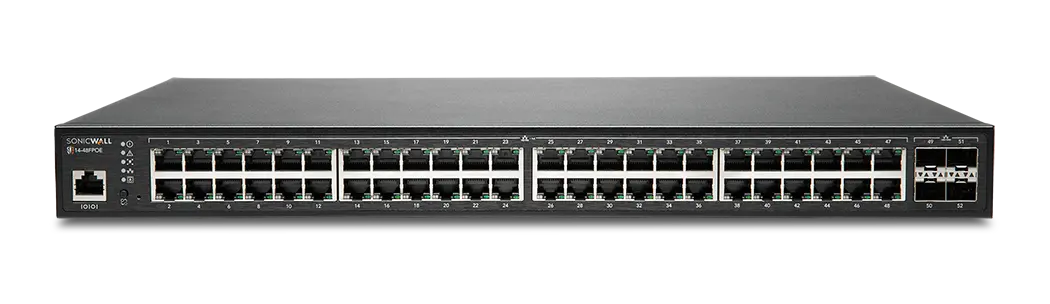 SonicWall Switch SWS14-48FPOE with 48 ports, 4 SFP+, 802.3at, compact form factor, energy-efficient design.